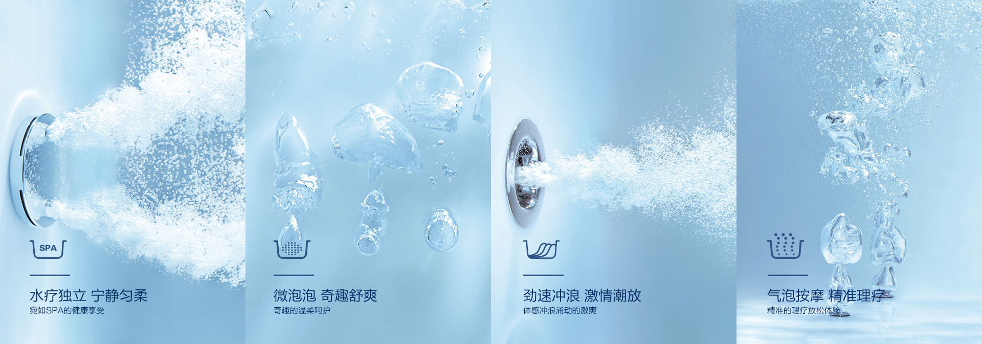 勁速沖浪按摩系統、微泡泡按摩系統及汽泡按摩系統四件模式供你選擇,讓你隨心所浴,樂享水悅生活
